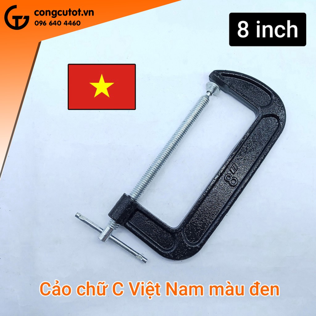 Cảo chữ C Việt Nam 8 inch được làm từ gang cứng bền bỉ, chống ăn mòn, bên ngoài phủ sơn tĩnh điện màu đen. Đây là dụng cụ kẹp linh hoạt được dùng để cố định tạm thời vật hoặc phôi. Sản phẩm ứng dụng trong nhiều lĩnh vực khác nhau như mộc, xây dựng, gia công kim loại…Làm từ gang cứng bền bỉ, chống ăn mòn, bên ngoài phủ sơn tĩnh điện màu đen