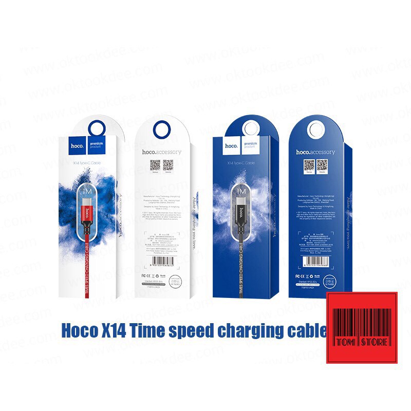 Vẫn là hộp giấy quen thuộc, đơn giản là vì giá rẻ nên Hoco ít khi chơi mấy hộp kim loại như anh WK hay Remax. Mà có vẻ như tụi Hoco cũng chịu học hỏi đôi chút về cách trình bày rồi. Đợt này sản phẩm mới của tháng 10 năm 2017 nên đã làm hộp đẹp hơn trước, ít ra cũng có thêm mấy cái chứng chỉ như FCC, CE, RoHS. Về bên trong vẫn là 1 sợi dây cáp bọc trong túi nylon có logo “hoco.” kèm dòng chữ “Make something you love”. Ngoài vỏ hộp sẽ có tên của dây cáp: X14 For Lightning, hình dây cáp được in nổi, và chiều dài của sợi dây. Phía bên hông có mã QRCode dùng để kiểm tra hàng có chính hãng không.