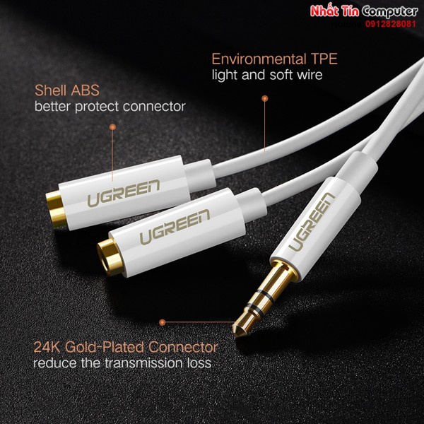 Cáp chia audio 3.5mm Ugreen 10739 đưởng trang bị lớp vỏ nhựa ABS cao cấp, các điểm tiếp xúc được mạ vàng 24k chống oxy hoá, vật liệu dây dẫn thuần đồng 100% mang đến độ bền, khả năng dẫn truyền tín hiệu ổn định, lọc âm tốt nhất cho sợi cáp.