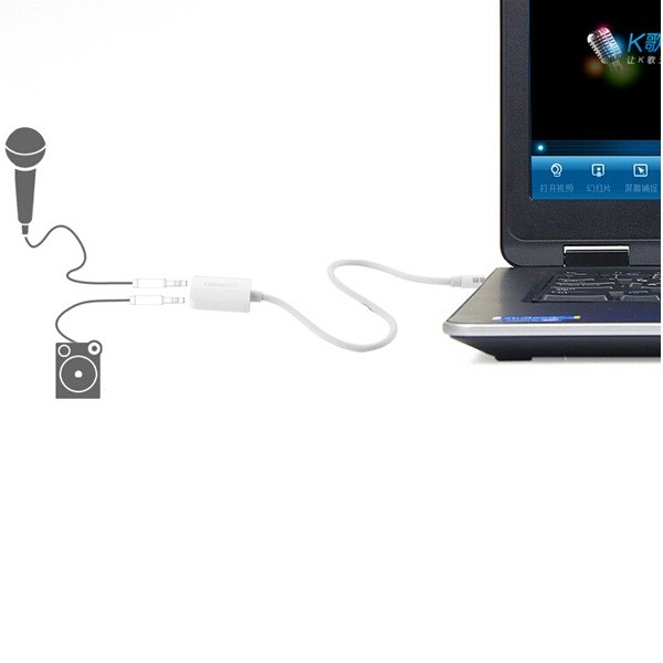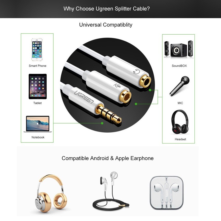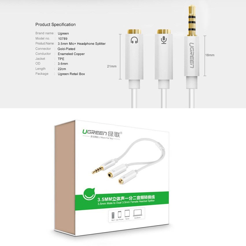 - Cáp chia Audio Ugreen UG-10789 là sản phẩm phù hợp đáp ứng được yêu cầu của bạn. Bạn có thể dễ dàng chát Yahoo, Skype, ghi âm...bằng microphone ngoài hoặc tai nghe có tích hợp Micro.