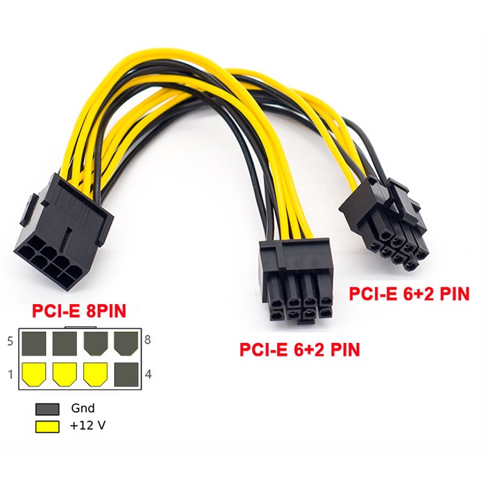 Cáp chia nguồn 8Pin CPU ra 2 x 8Pin (6+2)Một số máy tính, máy đào coin (trâu cày) dùng dual nguồn (2 nguồn) thì sẽ thừa ra 1 đầu 8pin cấp điện cho main (CPU) gây lãng phí. Sử dụng dây chia này để chuyển dầu 8pin dùng cho CPU sang 2 đầu 8pin(6+2) dùng cho card đồ họa (VGA).