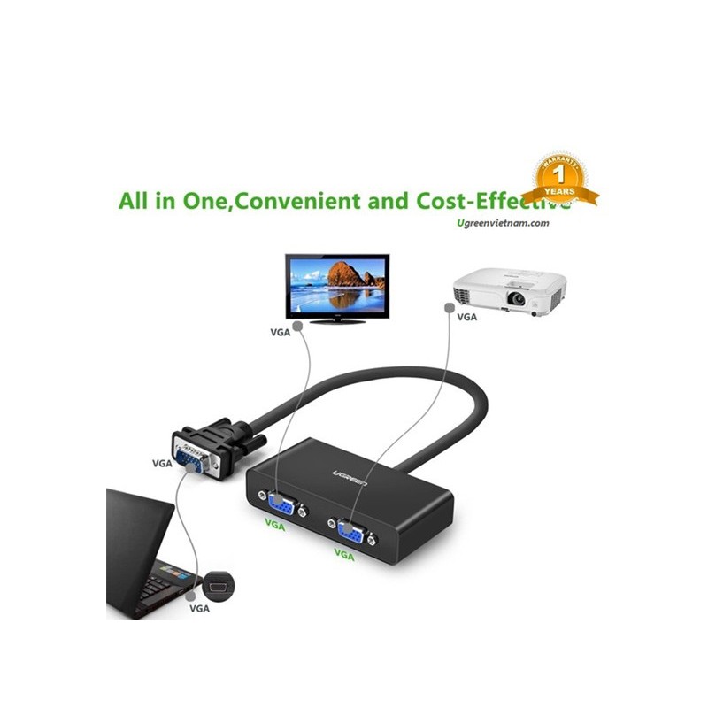 Cáp chia VGA 1 ra 2 chính hãng Ugreen 40254Cáp chia cổng VGA 1 ra 2 Ugreen 40254 cho phép bạn đồng thời phân phối tín hiệu video VGA từ một nguồn duy nhất để 2 VGA màn hình, máy chiếu, màn hình, cung cấp hình ảnh sống động chất lượng. Thích hợp trình chiếu cho đào tạo, triển lãm…