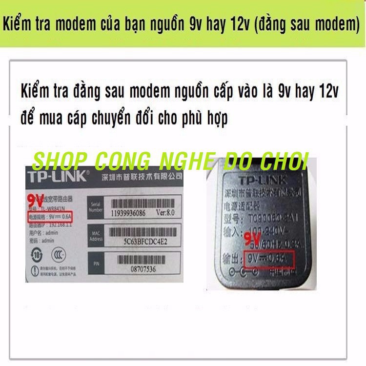 - Kiểm tra modem wifi nguồn vào là 9v hay 12v (ghi đằng sau của modem) để đặt mua cho phù hợp.