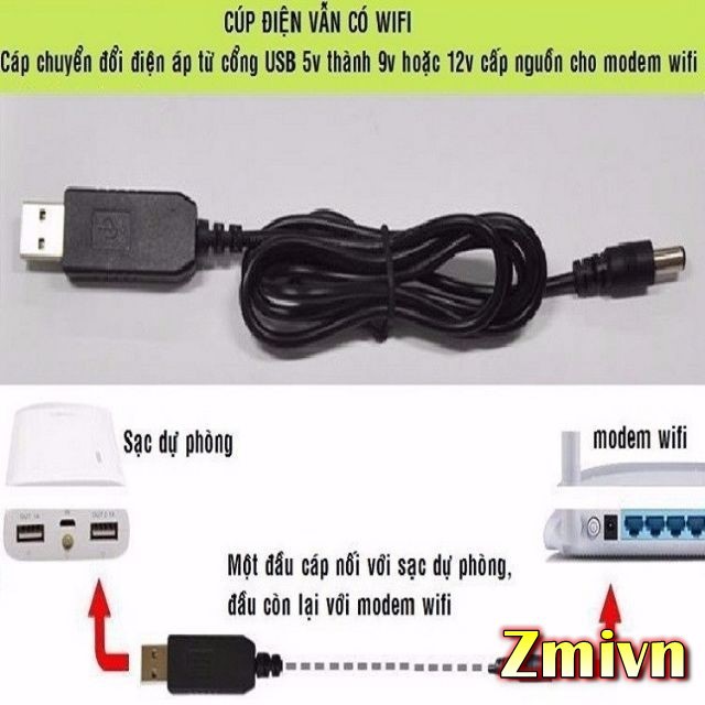 Cáp chuyển đổi điện áp từ cổng USB 5V sang 9V/12V cho Modem/Router WiFCáp chuyển đổi điện áp từ cổng USB 5V sang 9V/12V cho Modem/Router WiFi