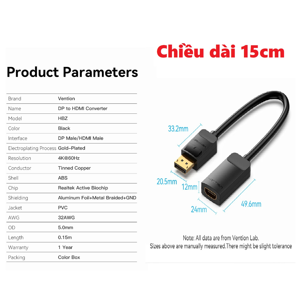 Cáp chuyển đổi DP male ra HDMI female 4K@60Hz-Thương hiệu : Vention-Model: HBZB-Xuất xứ: Trung QuốcMô tả:-Giao diện: DP male ra HDMI female (Chỉ hỗ trợ chiều này, không hỗ trợ chiều HDMI ra DP!!!)- D...- Giao hàng toàn quốc