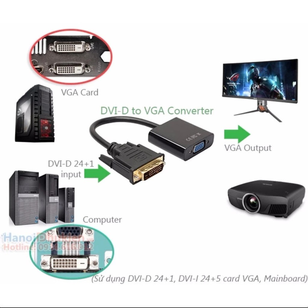 Tích hợp chipset chuyển đổi bên trong, sử dụng kết nối Card đồ họa máy tính, Mainboard máy tính bàn, máy tính đồng bộ có DVI ra màn hình máy tính, máy chiếu.Đầu chuyển đổi DVI-D 24+1 sang VGA trên thị trường không chuyển đổi được.