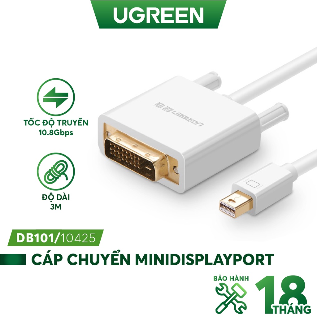 Cáp chuyển đổi Mini Displayport to DVI dài 3m Ugreen 10425 cho phép bạn kết nối một màn hình máy tính DVI với card video Mini DisplayPort giúp tiết kiệm các chi phí của việc nâng cấp màn hình cho khả