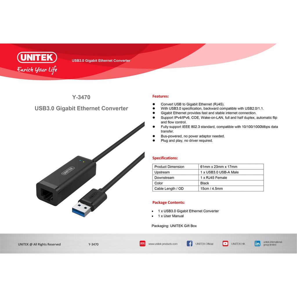 Máy tính & Laptop > Thiết Bị Lưu Trữ > USB & OTG || Cáp chuyển đổi từ USB to LAN Unitek Y-3470 hỗ trợ Lan Gigabit 10/100/1000Mbps chính hãngCòn hàng