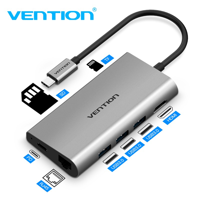 Máy tính & Laptop > Phụ Kiện Máy Tính > Bộ chia cổng USB & Đọc thẻ nhớ || Cáp chuyển đổi Type-C 8 trong 1 (HDMI, RJ45, TF, SD, USB 3.0) - VentionCòn hàng