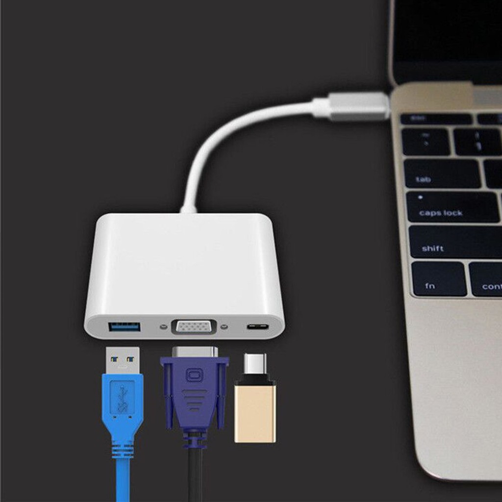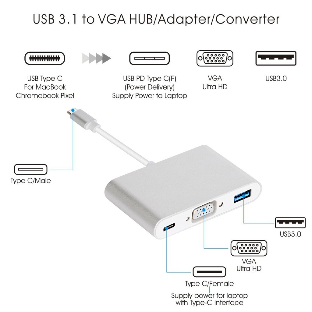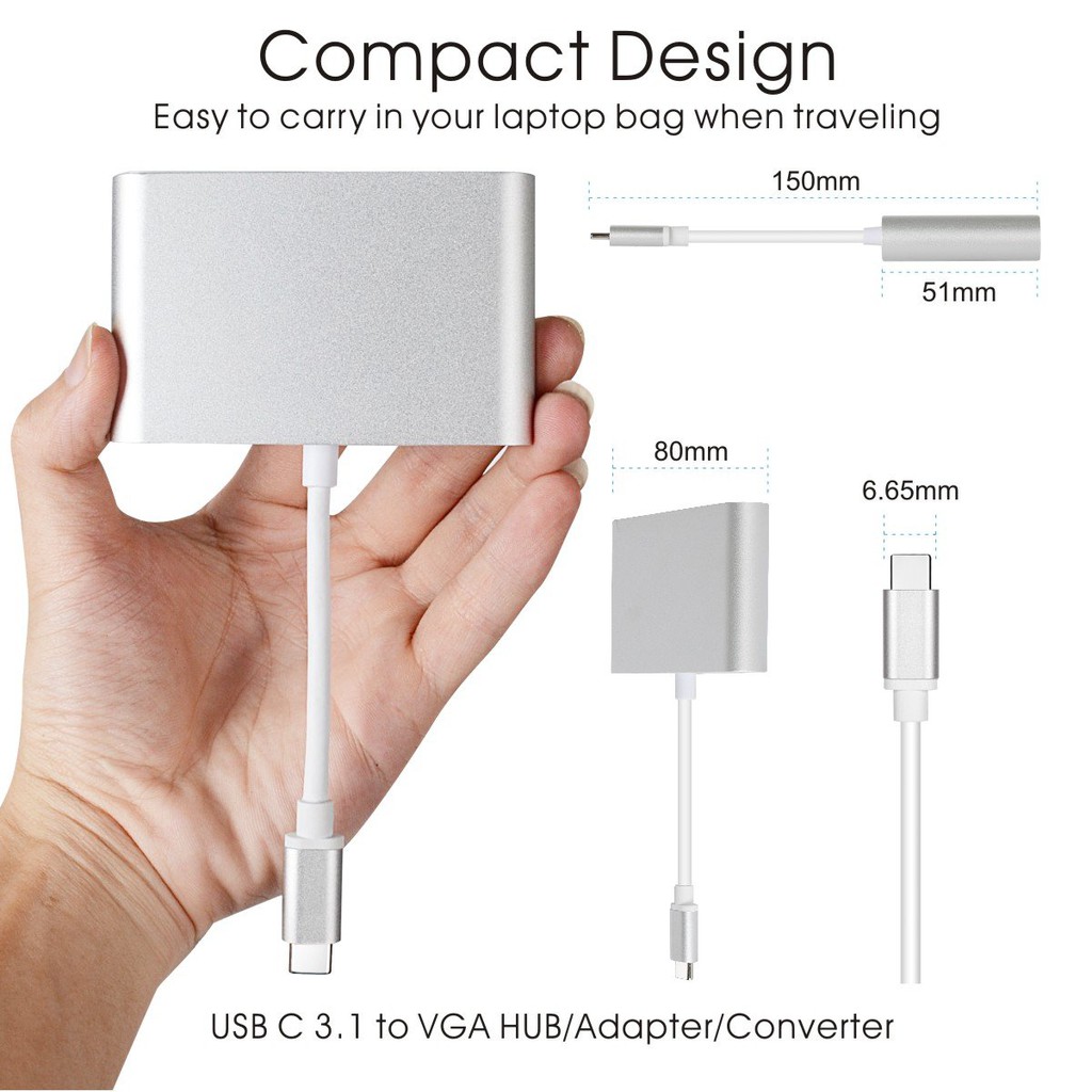 Bộ chuyển đổi USB C 3.1 sang VGA / Hub là trợ thủ tốt cho máy tính xách tay của bạn.1) Nó mở rộng màn hình thiết bị USB-C của bạn để xem video và hình ảnh lớn hơn
