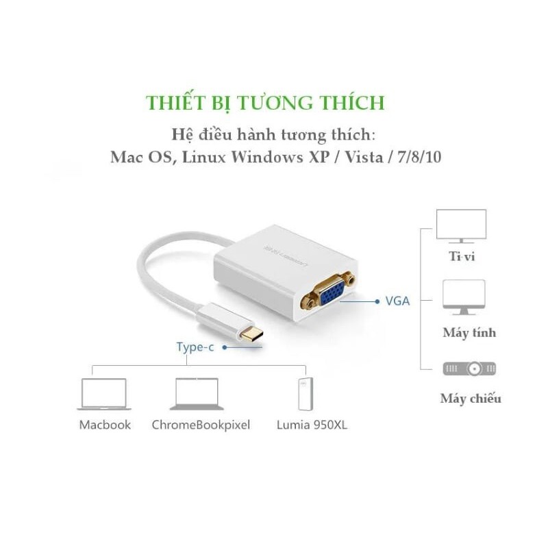 Cáp Chuyển Đổi Ugreen USB Type-C Sang VGA 40274 (20cm) giải pháp hoàn hảo cho kết nối: MacBook, Chromebookor hay ASUS Zen, AiO PC với máy chiếu, màn hình máy tính giúp hiển thị hình ảnh ở độ phân giải cao.