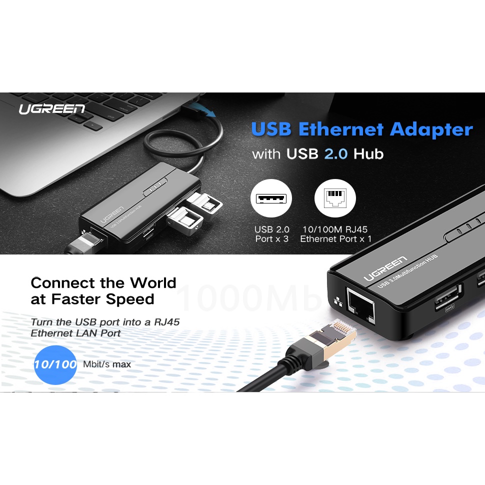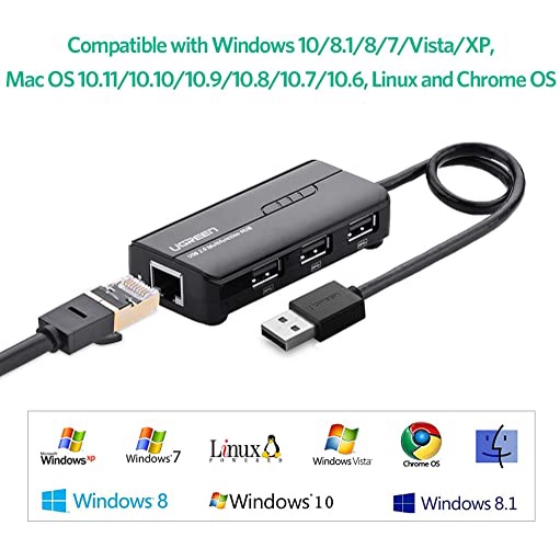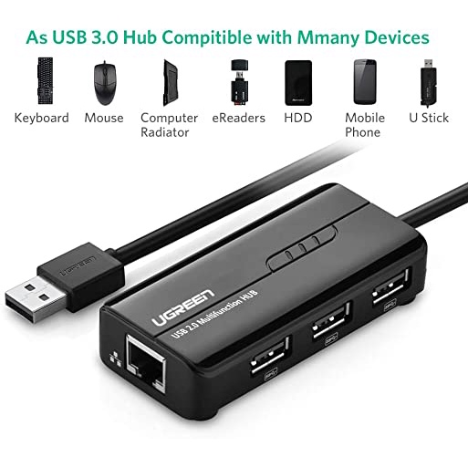 Cáp chuyển đổi USB to Lan RJ45 3 x USB Ugreen 20264 20265 - Hàng Chính HãngBộ chia 3 cổng USB 2.0 kèm cổng mạng Ethernet 10/100Mbps Ugreen 20264 không chỉ có thể thêm một giao diện mạng để máy tính của bạn thông qua cổng USB,nhưng cũng để kết nối máy tính của bạn cho nhiều thiết bị, chẳng hạn như máy ảnh kỹ thuật số, quạt máy tính, điều khiển đèn flash. Nó là một giải pháp lý tưởng cho các máy tính xách tay, máy tính bảng mà không đi kèm với cổng ethernet.