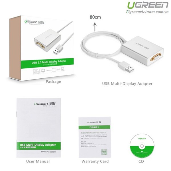 - Cáp chuyển đổi USB to VGA chính hãng Ugreen 40244 được thiết kế để nhanh chóng và dễ dàng thêm thêm một màn hình để kích hoạt USB của bạn (USB 2.0 hoặc mới hơn) máy tính ở độ phân giải lên đến 1920x1080.