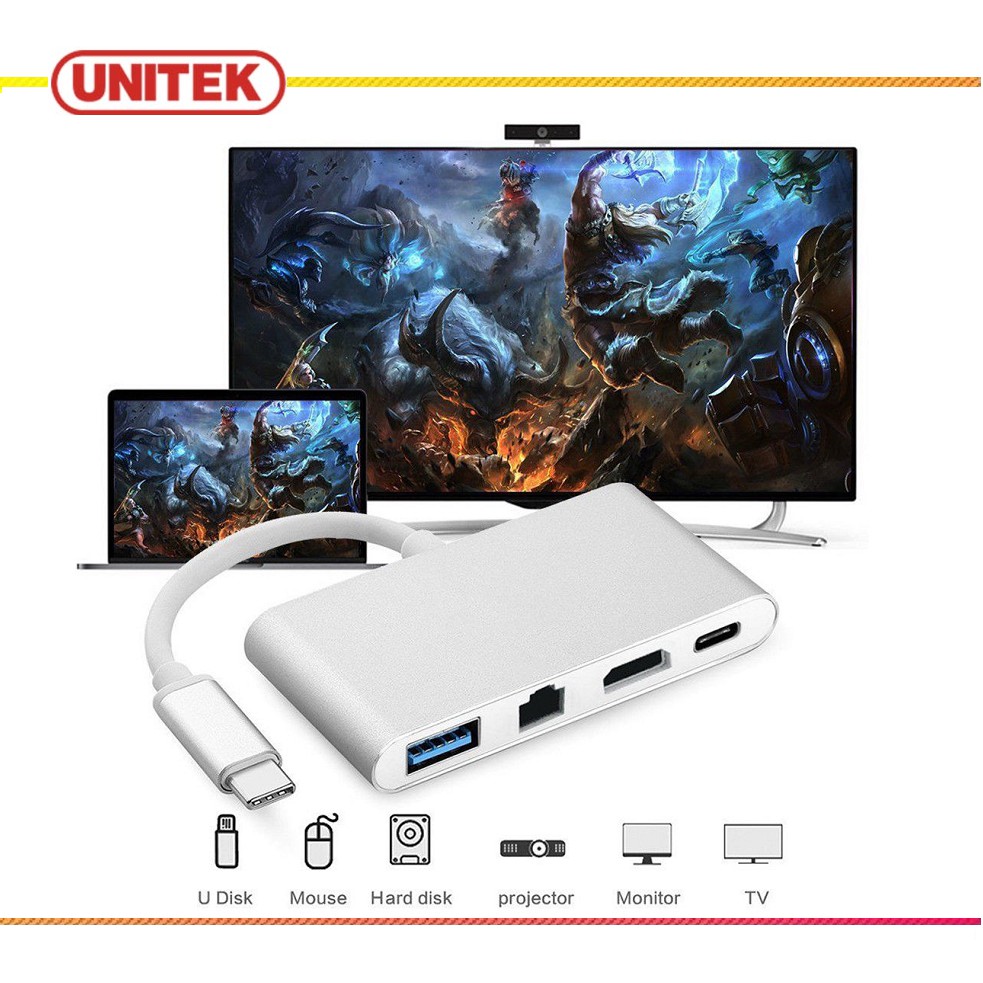 cáp chuyển đổi USB Type-C sang HDMI, Hub USB và cổng Lan 10/100Mbps- Cáp chuyển đổi USB-C to HDMI / Ethernet / Hub USB 2.0 được thiết kế để kết nối MacBook với cổng USB-C để một hiện HDTV, màn hình hoặc máy chiếu với HDMI với độ phân giải lên đến 4K. ( 4096x2160 )