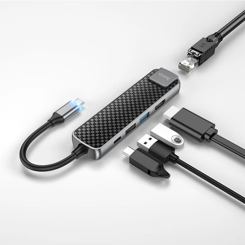 Cáp Chuyển Hub Hoco HB23 5 in 1 Type C Ra 3 Usb 3.0 + HDMI 4k+ Mạng Lan Và Cổng Sạc PD 65W