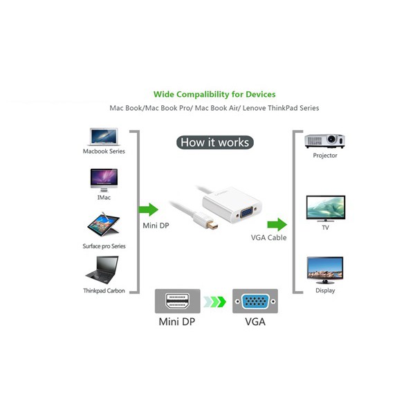 Cáp chuyển Mini Displayport to VGA Ugreen 10458 giúp kết nối cổng Mini DisplayPort / Thunderbolt trên PC, Macbook hoặc card đồ họa (MacBook Pro, MacBook Air, iMac, Mac mini, Mac Pro, Lenovo ThinkPad và Microsoft Surface Pro) với một HDTV, màn hình, hoặc máy chiếu với chuẩn VGA hỗ trợ video độ nét cao 1920×1080.Chi tiết cáp chuyển Mini Displayport to VGA (trắng) Ugreen 10458
