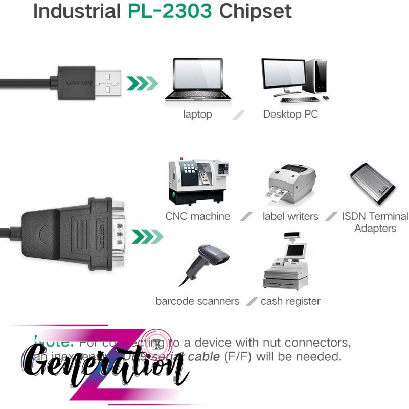 2. Ugreen 30988 với đầu nối đực chuẩn USB 2.0 loại A với đầu nối nối tiếp 9 chân RS-232 DB9 tiêu chuẩn với đai ốc lục giác. Lưu ý: Để kết nối với thiết bị có đầu nối đai ốc, cần có cáp nối tiếp DB9 (F / F).