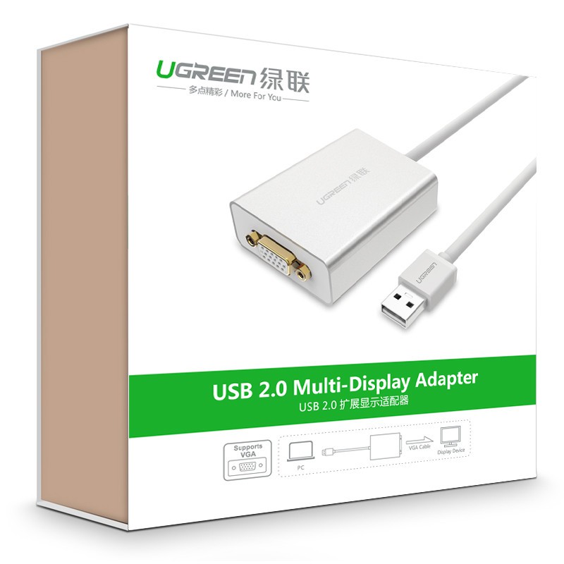 Cáp chuyển đổi USB to VGA chính hãng Ugreen 40244 Cao cấpCáp USB 2.0 to VGA Ugreen 40244 là thiết bị cao cấp giúp bạn dễ dàng mở rộng thêm màn hình hiển thị chuẩn VGA cho máy tính, Laptop của bạn với nhiều chế độ hiển thị khác nhau bao gồm: Chế độ gương, Extend, Second Screen.. tạo điều kiện thuận lợi để làm việc đa nhiệm tiết kiệm thời gian cho bạn. Bạn có thể sử dụng nhiều thiết bị này cùng lúc nếu có nhu cầu sử dụng nhiều màn hình hơn.