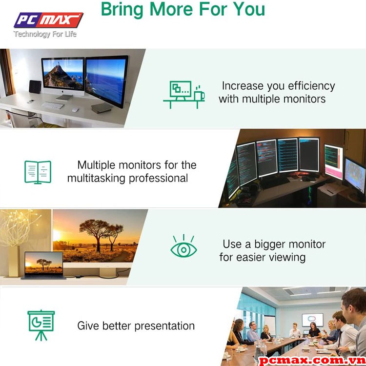 Ugreen 40229 nhanh chóng và dễ dàng giúp người dùng thêm 1 màn hình cho máy tính qua cổng usb. Thiết bị truyển tải hình ảnh sắc nét cho nhiều màn hình. Bạn có thể sử dụng 1 máy tính và nhiều chương trình khác nhau cho nhiều màn hình hiển thị. Khi bạn tắt 1 chương trình trên 1 màn hình thì các chương trình khác vẫn chạy bình thường, không hề bị ảnh hưởng