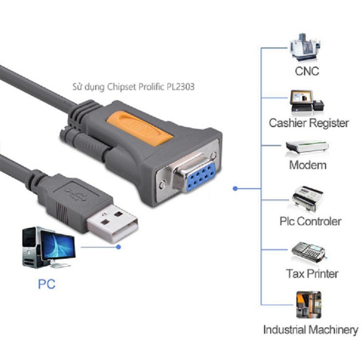 - Cáp USB to Com DB9 RS232 1.5M chính hãng Ugreen 20201 chuyển đổi Adapter Cable được thiết kế để kết nối các thiết bị nối tiếp như máy tính DB9 trang bị , thiết bị định tuyến , GPS , máy quét mã vạch , nhà văn nhãn , modem nối tiếp , máy ảnh kỹ thuật số , đầu đọc thẻ , máy tính cọ, Điện thoại di động , PDA , hoặc ISDN ga Adapters thông qua cổng USB với hơn tốc độ truyền dữ liệu 1Mbps .