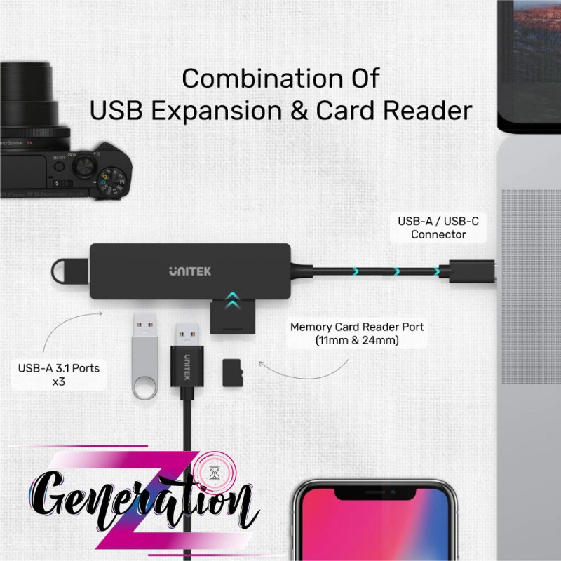 Máy tính & Laptop > Phụ Kiện Máy Tính > Bộ chia cổng USB & Đọc thẻ nhớ || Cáp chuyển USB Type-C ra 3 cổng USB 3.0 + Card Reader (SD / Micro SD) Unitek H1108BCòn hàng