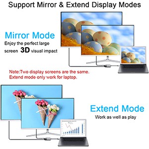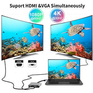 [Bộ chuyển đổi hiển thị USB Type-c sang HDMI/ VGA] Được trang bị Cổng HDMI mang lại chất lượng hình ảnh độ phân giải cao Max 4K UHD 4096 × 2160 @ 30Hz. Hiển thị VGA lên đến FHD 1080P @ 60Hz. Khi hai cổng hoạt động đồng thời, độ phân giải tối đa là cả hai đạt tới 1080P @ 60Hz. Xin lưu ý: Không hỗ trợ Hai màn hình để hiển thị nội dung khác nhau một cách riêng biệt.