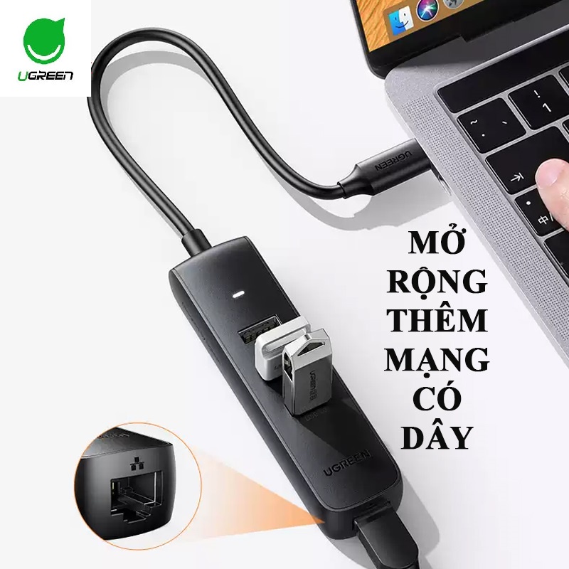 - Cáp USB Type C to LAN + Hub USB 3.0 chính hãng Ugreen là 1 sản phẩm khá tiện ích, kết hợp tính năng của 2 sản phẩm là USB LAN và Hub USB. Nó giúp bạn vừa kết nối mạng dây với tốc độ 10/100Mbps, vừa kết nối máy tính, laptop với các thiết bị ngoại vi dùng cổng USB như chuột, bàn phím, ổ cứng,…với tốc độ cao lên tới 5Gbps.