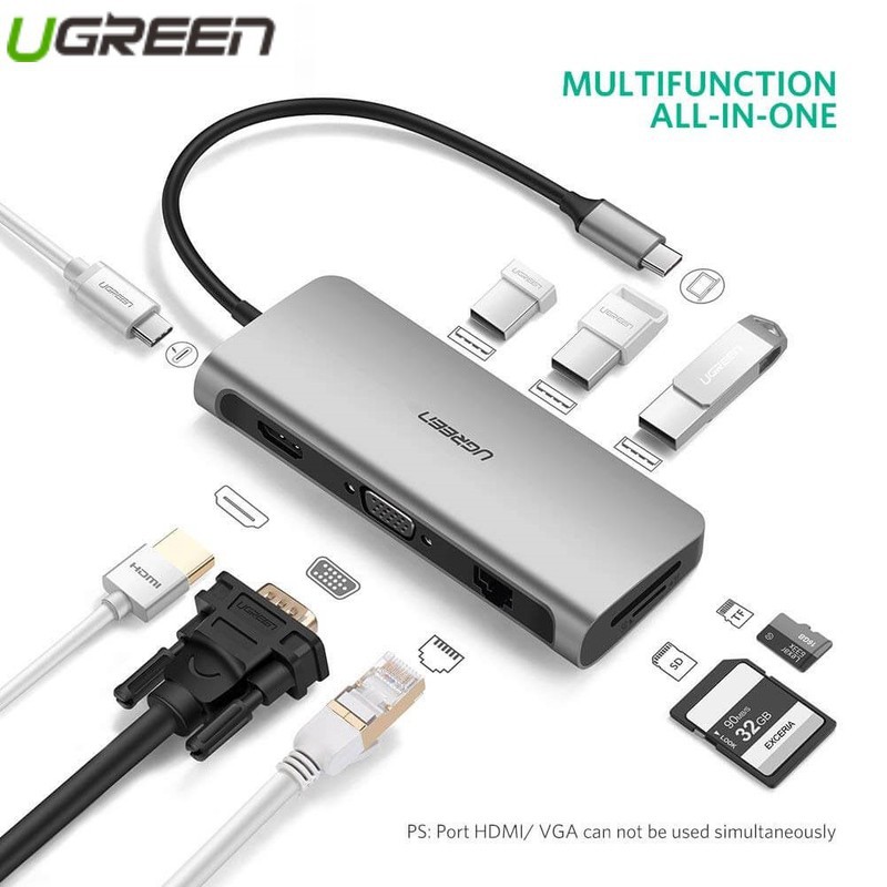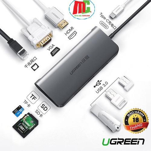 Cáp Chuyển USB Type C Sang Các Cổng HDMI + VGA + 3 Cổng USB 3.0 + Lan Gigabit RJ45 + SD,TF Ugreen 40873 - Chính Hãng