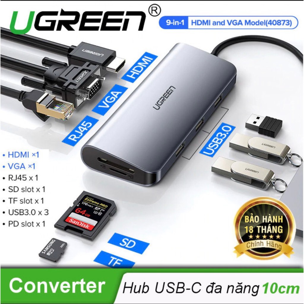 Máy tính & Laptop > Thiết Bị Lưu Trữ > USB & OTG || [Mã 273ELHA100K0 hoàn 7% đơn 500K] Cáp Chuyển USB Type C Sang 3xUSB 3.0+HDMI+RJ45+SD,TF Ugreen [9in1] (40873)Còn hàng