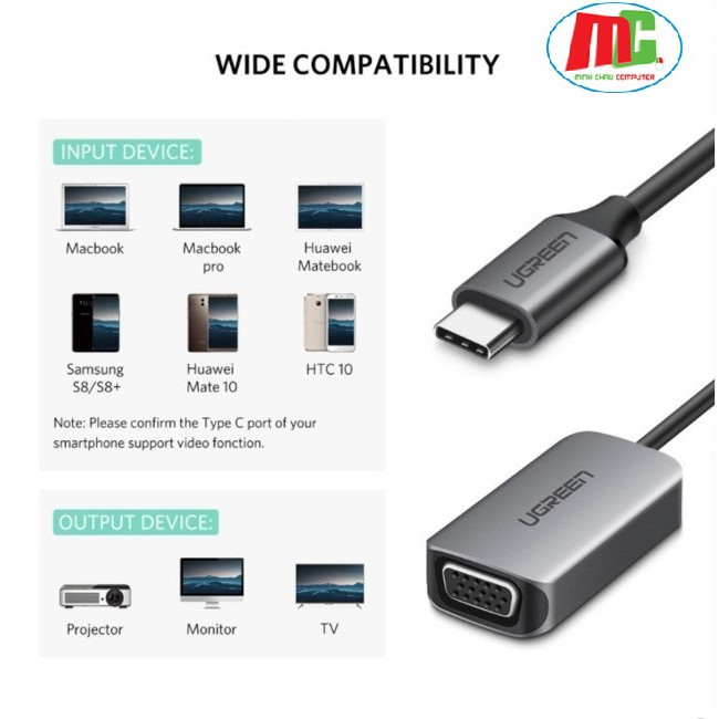 - Bộ chuyển đổi USB-C sang VGA của Ugreen 50316 được thiết kế để kết nối các máy tính mới được phát hành như MacBook 2015, Google Chromebook Pixel hoặc ASUS Zen AiO PC với HDTV, màn hình hiển thị hoặc máy chiếu có giao diện VGA ở độ phân giải lên đến 1080P. Dự định xuất ra nội dung do người dùng tạo như thuyết trình và tài liệu công việc, nó cũng có thể hoạt động để tăng năng suất của bạn bằng cách mở rộng máy tính để bàn của bạn lên màn hình phụ, nhân đôi không gian làm việc có sẵn.