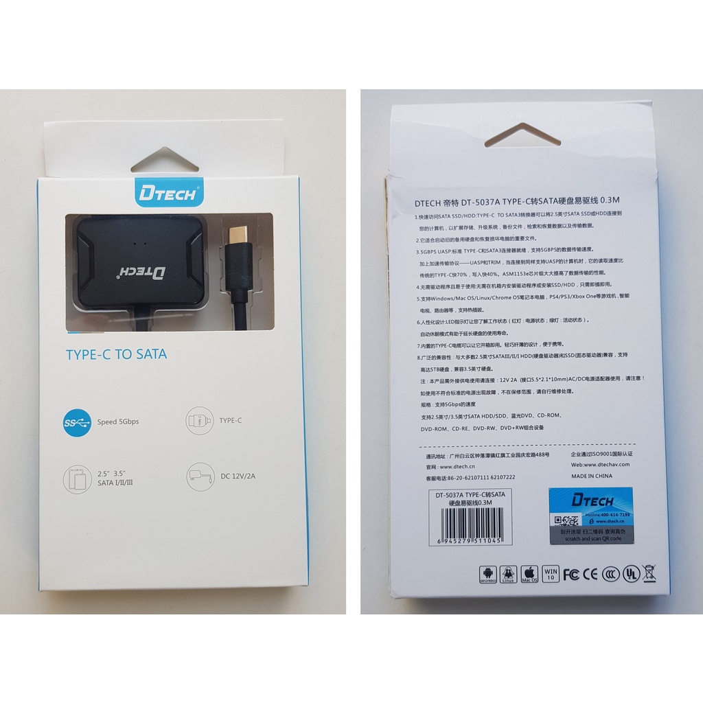 Giới thiệu Cáp đọc dữ liệu ổ cứng từ type c sang Sata 1,2,3 Dtech có cổng cấp nguồn phụ 12V/2A