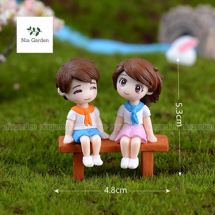 Giới thiệu Cặp đôi tiểu cảnh tượng học sinh quàng khăn ngồi ghế trang trí vườn chậu cây terarium hồ cá Nia Garden N5
