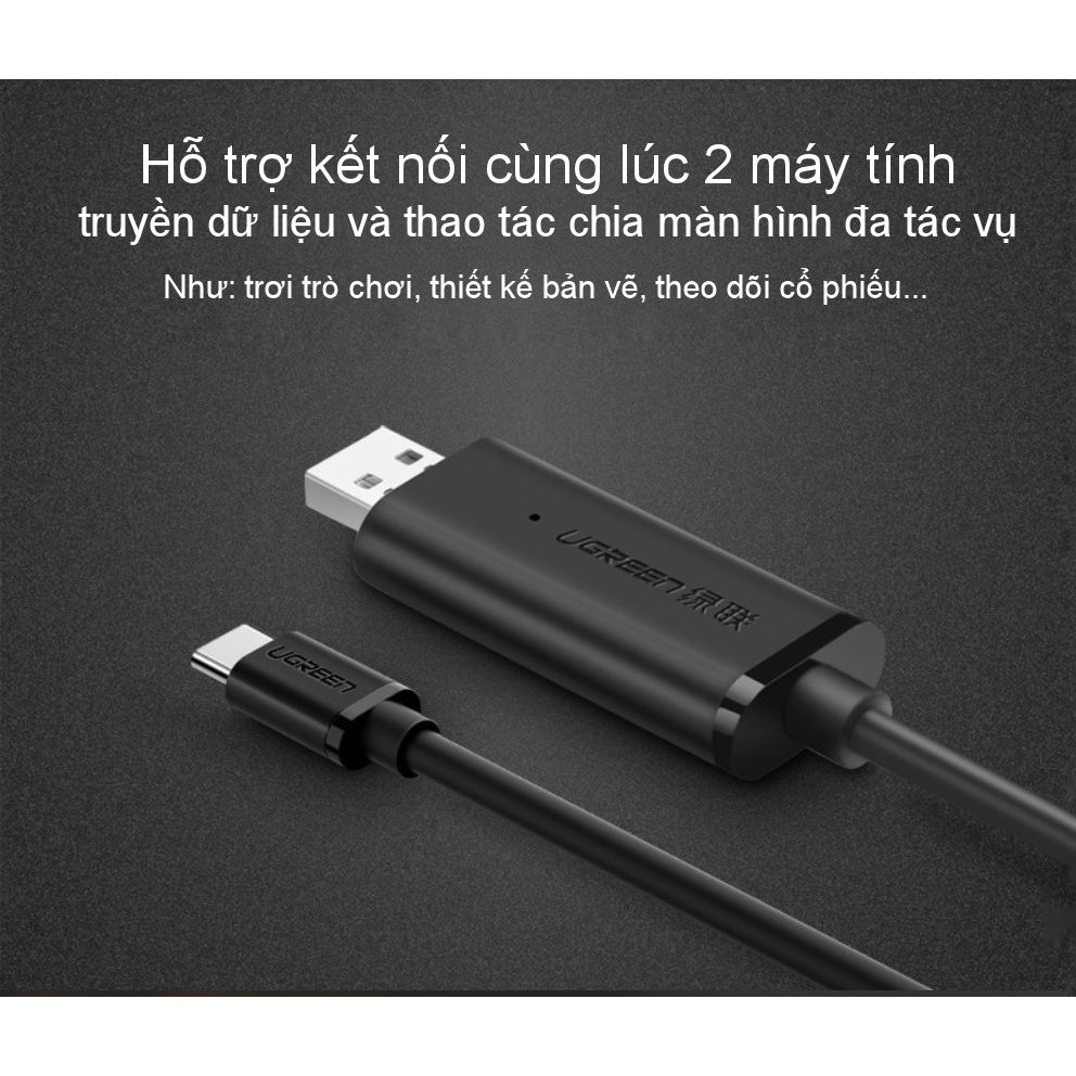 Cáp dữ liệu USB 3.0 sang USB type C tích hợp chipsetCho phép kết nối 2 máy tính cùng lúc để truyền dữ liệu hoặc thao tác chia màn hình đa tác vụ (sử dụng 2 màn hình với cùng một PC, bàn phím, chuột, ứng dụng trong nhiều trường hợp như: chơi trò chơi, thiết kế bản vẽ, theo dõi cổ phiếu trực tuyến...