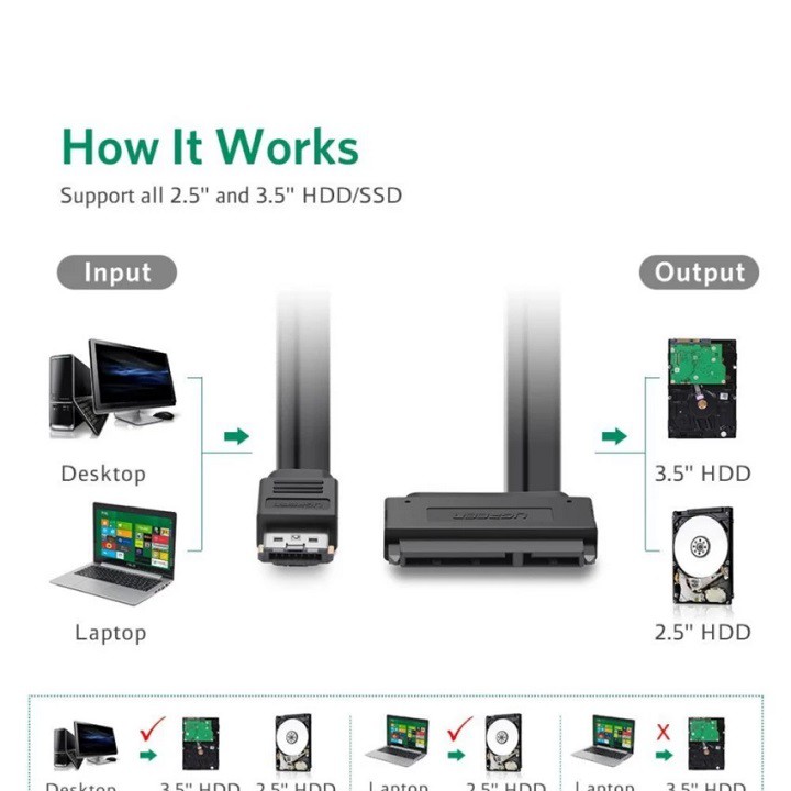 Đầu nối eSATAp combo USB sang SATA UGREEN 10646 thích hợp với các loại máy tính, laptop hỗ trợ cổng eSATAp, nguồn 5V/12V sang cổng ổ cứng 2.5" hoặc 3.5"Ugreen eSATAp sang SATA cho phép bạn kết nối nguồn qua cổng eSATAp hỗ trợ 5V / 12V đến SATA 22 Pin HDD.