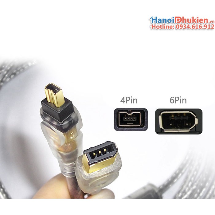Cáp IEEE 1394 (cáp firewire) đầu 4Pin chân nhỏ sang 6Pin. Sử dụng kết nối các thiết bị âm thanh, thiết bị thu âm, hdd box 1394, card capture, laptop có 1394...Cáp hay dùng kết nối máy quay phim, máy ảnh đổ hình ảnh vào máy tính PC, Laptop qua card capture 1394 hay box ghi hình 1394