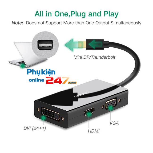 Màn hình hiển thị nhỏ của Ugreen đến HDMI DVI VGA Adapter kết nối máy tính tương thích Mini DisplayPort / Mini DP / Thunderbolt Port với HDTV, màn hình hoặc máy chiếu với cổng HDMI / VGA / DVI. Cần có cáp HDMI / VGA / VGA riêng biệt (bán riêng). GHI CHÚ QUAN TRỌNG: Không thể sử dụng cổng HDMI, VGA và DVI đồng thời.
