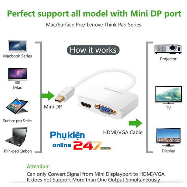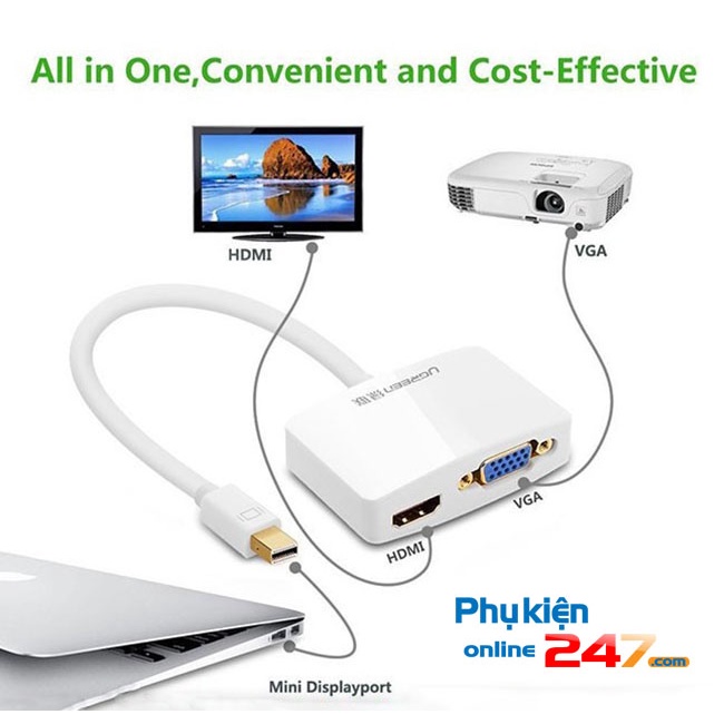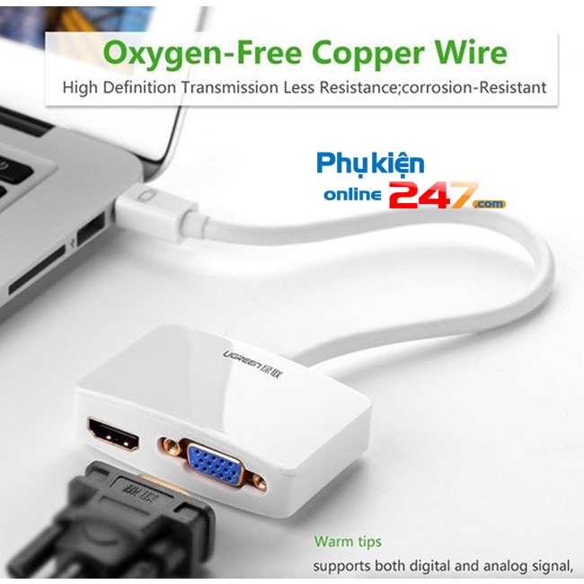 Thunderbolt sang HDMI và VGA có chức năng chuyển đổi âm thanh và video từ máy tính (macbook air, macbook pro) hoặc máy tính bảng tới màn hình TV qua cổng HDMI; bộ chuyển đổi kết nối Mini DisplayPort (cổng hình sét) sang HDMI, màn hình hoặc máy chiếu với cáp HDMI / VGA.