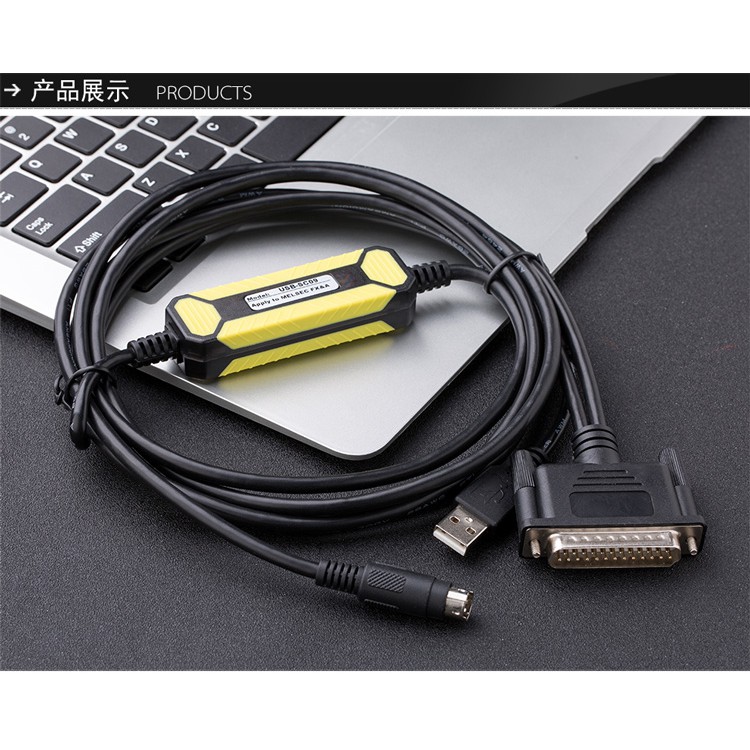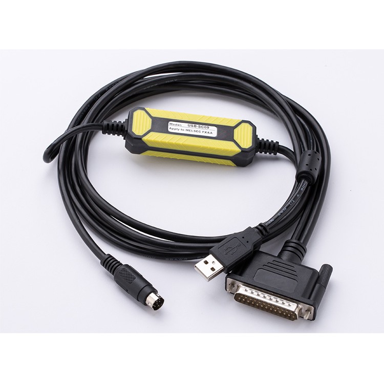 Cáp lập trình PLC Mitsubishi USB-SC09 (USB sang đầu tròn 8 chân và DB 25 chân) cho dòng PLC Mitsubishi FX và A seriesGiao diện: pin USB sang DB25 chân và 1 chân tròn 8 chân.