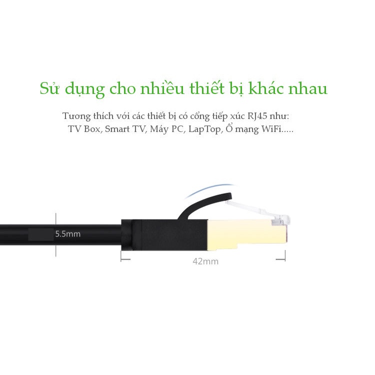 - Cáp mạng đúc sẵn CAT7 được Ugreen thiết kế với kiểu dáng tròn, cực kì thuận tiện cho việc di dây. Với sợi cáp được làm bằng đồng nguyên chất cùng với 2 đầu cáp được bọc bằng kim loại mạ vàng 24k chống nhiễu sóng, giúp tốc độ đường truyền cực kì nhanh chóng, ổn định và bền vững trước mọi loại thời tiết ở Việt Nam.