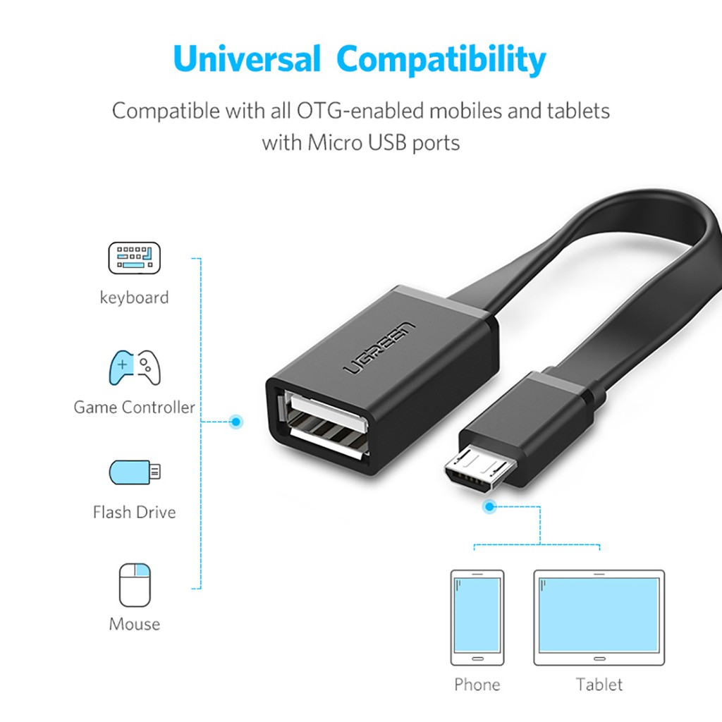 Cáp Micro USB ra USB 2.0 Hỗ trợ OTG Cao Cấp UGREEN là dòng sản phẩm chất lượng trên thị trường hiện nay, được dùng để kết nối các thiết bị hỗ trợ đầu ra Micro USB với các thiết bị ngoại vi hỗ trợ đầu vào USB 2.0 như chuột, bàn phím, máy chơi game cầm tay, máy in... vô cùng tiện lợi và nhanh chóng, cắm là chạy không cần cài đặt.THÔNG SỐ KỸ THUẬT