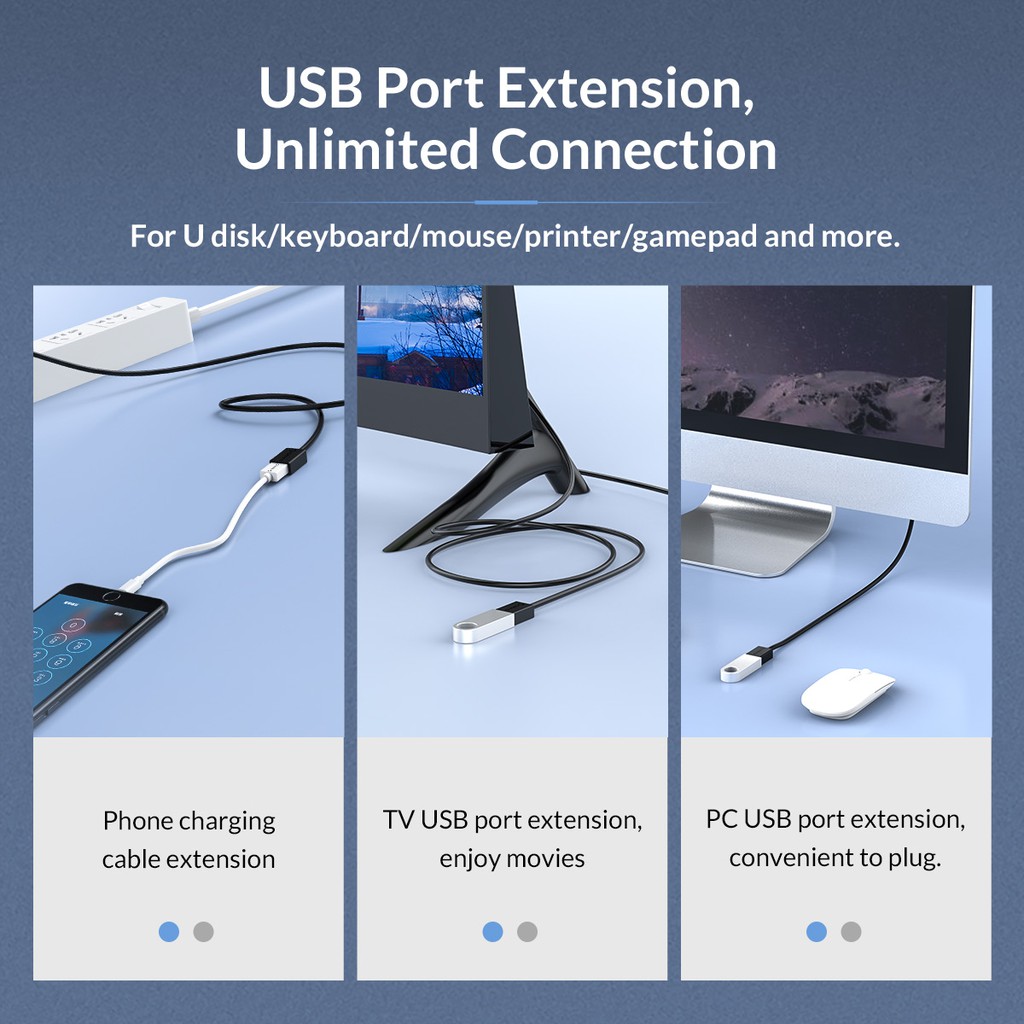 Cáp Nối Dài USB Orico U3-MAA01 USB 3.0 có thiết kế đơn giản, nhỏ gọn, tiện dụng, được thiết kế để sạc và truyền tải dữ liệu cho nhiều loại điện thoại như Samsung, Oppo, Sony, Nokia,