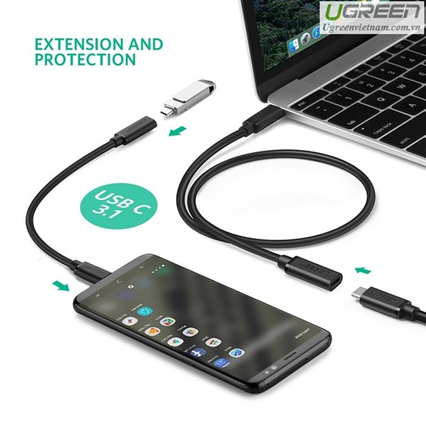 - Cáp nối dài UGREEN USB Type-C thiết kế giúp mở rộng kết nối giữa các thiết bị có cổng Type-C bị giới hạn về chiều dài hoặc vị trí, giúp mọi việc trở nên dễ dàng và thuận tiện hơn