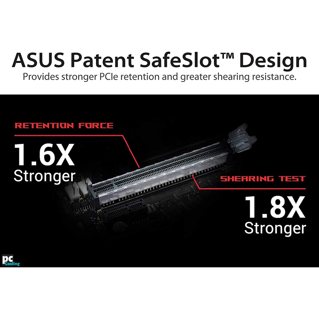 - SafeSlot™ PCI-E đã được cấp bằng sáng chế của ASUS: Với quy trình sản xuất mới bao gồm các bọc kim loại gia cường và điểm hàn bổ sung, SafeSlot™ đảm bảo kết nối card đồ họa của bạn chắc và bền.