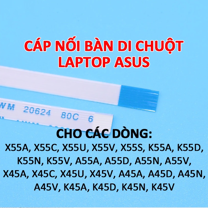 Cáp nối touchpad ( chuột cảm ứng ) laptop Asus được dùng để thay thế cáp zin trong các dòng laptop Asus A45 series, K45 series, X45 series, Asus A55 series, K55 series, X55 series như: X45A, X45C, X45U, X45V / X45VD, A45A, A45D, A45N, A45V, K45A, K45D (K45DR, K45DE), K45N, K45V (K45VD, K45VJ, K45VS, K45VM, K45VG), X55A, X55C, X55U, X55V / X55VD, X55S (X55SV, X55SR), K55A, K55D (K55DR, K55DE), K55N, K55V (K55VD, K55VJ, K55VM), A55A, A55D (A55DE, A55DR), A55N, A55V (A55VD, A55VJ, A55VS) có các style AWM 20706, AWM 20798, AWM 20861, AWM 2896, AWM 20696 của các hãng: Xinya, CviLux, HAMBURG-SH-HF, High-Tek, JI-HAW, YOUNGSHIN-T, ... có các số hiệu: E476580, E208903-3, E235863, E353411, E118077, E221612, E353750,...Hàng mới 100%. Giá cho 1 sợi.