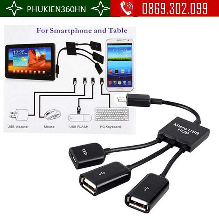 Cáp OTG ra OTG + 02 USB 2.0Cáp OTG ra OTG + 02 USB 2.0 Micro USB HUB OTG 3 trong 1 hỗ trợ kết nối cho những máy có tính năng OTG qua cổng Micro USB, nhằm để sử dụng chuột, bàn phím, đầu đọc thẻ nhớ, đọc USB Flash trên máy tính bảng và smartphone Android. Micro USB HUB OTG 3 trong 1 gồm một cổng MicroUSB cái và ba cổng USB cái với chiều dài tổng cộng là 20cm, vừa phải và tiện dụng.