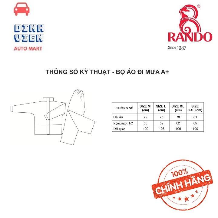[ CAO CẤP] Rando Bộ quần áo đi mưa A+ (thông dụng) ASNS-38 giúp che chở cho người nhân yêuDV AUTO MART xin giới thiệu sản phẩm Áo mưa rando Bộ A+ (thông dụng) ASNS-38. Linh hoạt và an toàn. Sản phẩm tiện lợi giúp người mặc thuận tiện hơn trong những ngày mưa bão