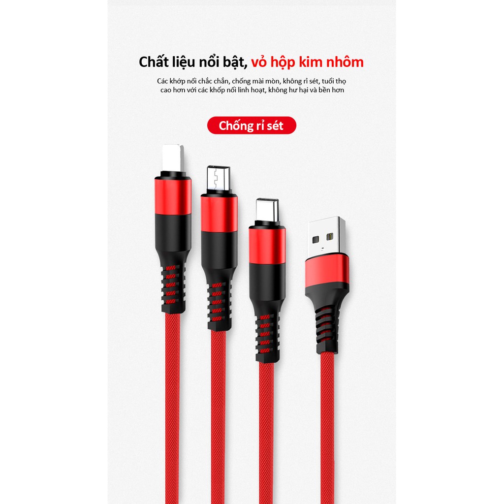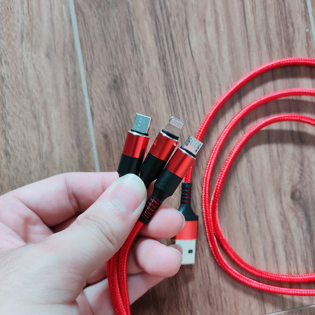 Điện Thoại & Phụ Kiện > Phụ kiện > Cáp, sạc & bộ chuyển đổi > Bộ sạc du lịch || Cáp sạc 3 đầu đa năng KLH 3D, dây sạt nhiều đầu dọc dù chống đứt iphone micro typec dài 1mCòn hàng
