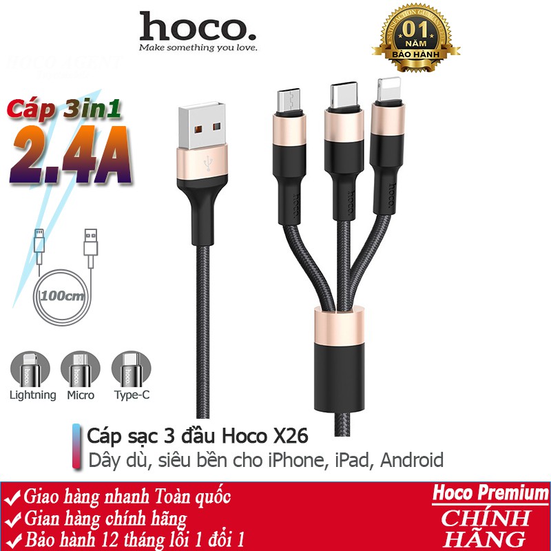 Điện Thoại & Phụ Kiện > Phụ kiện > Cáp, sạc & bộ chuyển đổi > Cáp & Bộ chuyển đổi di động || Cáp sạc 3 đầu Hoco X26 siêu bền gồm Lightning, Micro, Type-C dây dài 1m - Chính hãngCòn hàng