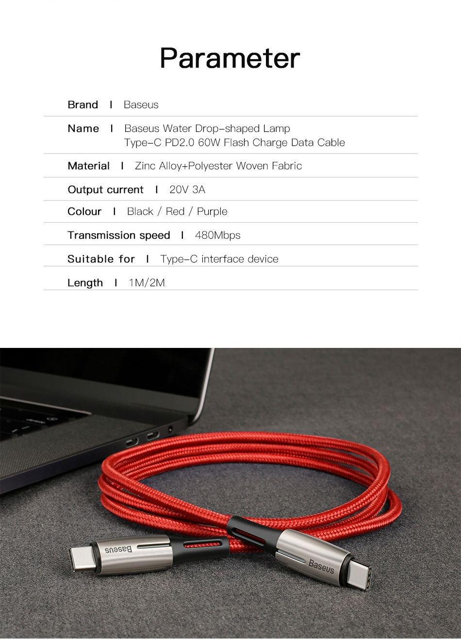 Cáp sạc siêu nhanh dành cho Smartphone/iPad/ Macbook (Type-C/QC3.0/PD) công suất 60W - Baseus Water Drop-Shaped Lamp C to C hỗ trợ cho các dòng thiết bị thông minh đầu Type C. Sản phẩm nổi bật với khả năng sạc nhanh 3.0 Power Delivery và tốc độ truyền dữ liệu ổn định 489Mbps.