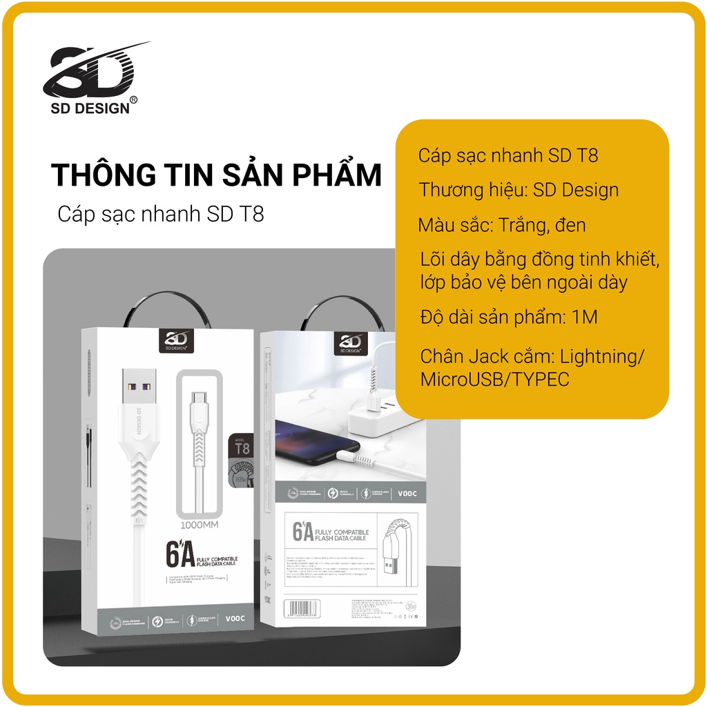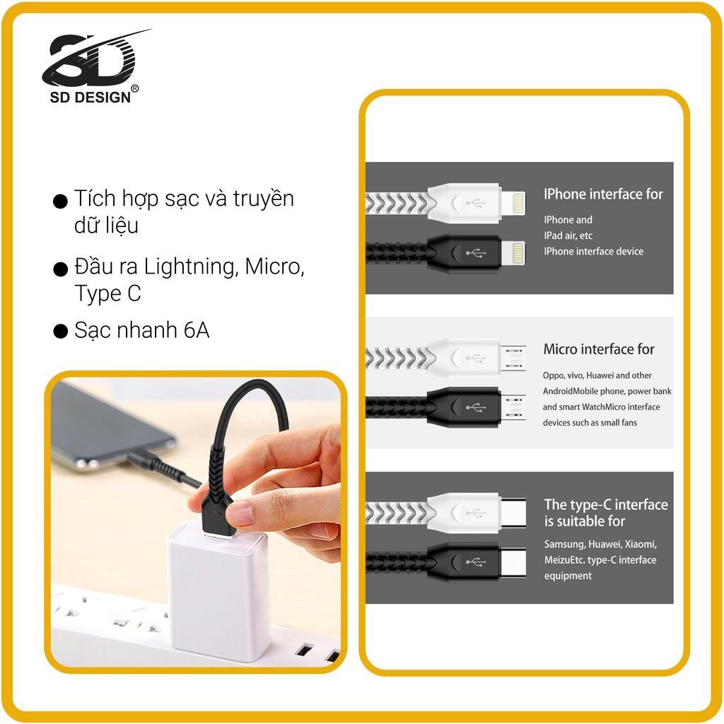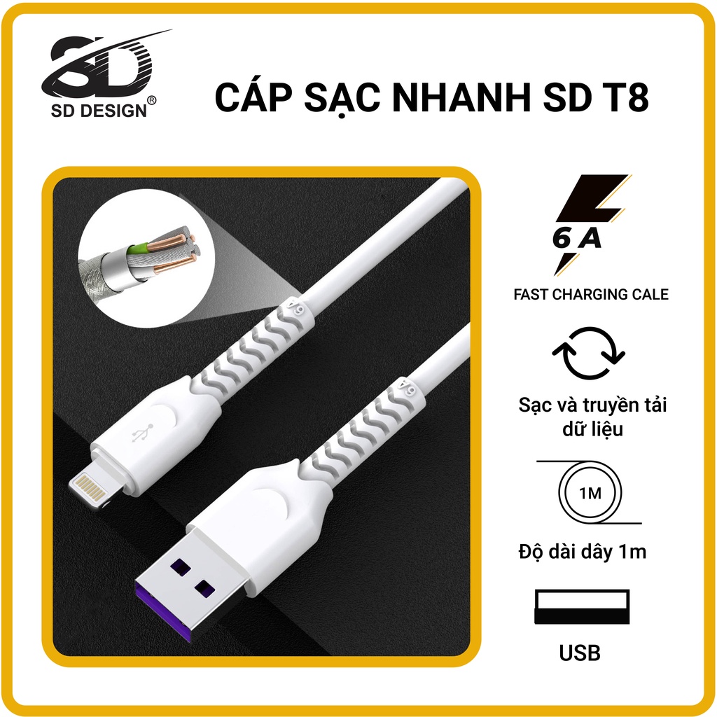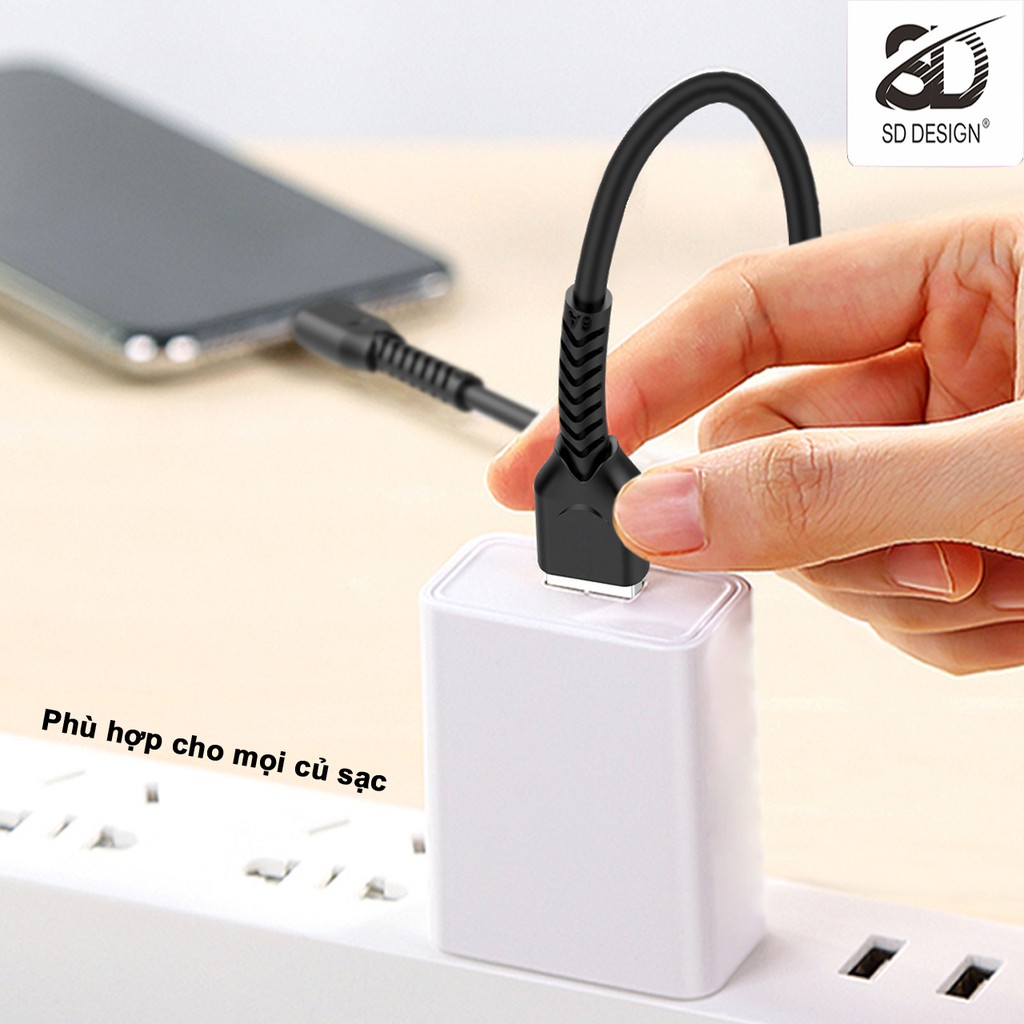 Cáp sạc chính hãng SD DESIGN T8 giúp sạc nhanh, đầy đủ chân lightning Iphone, MicroUSB, Type C
